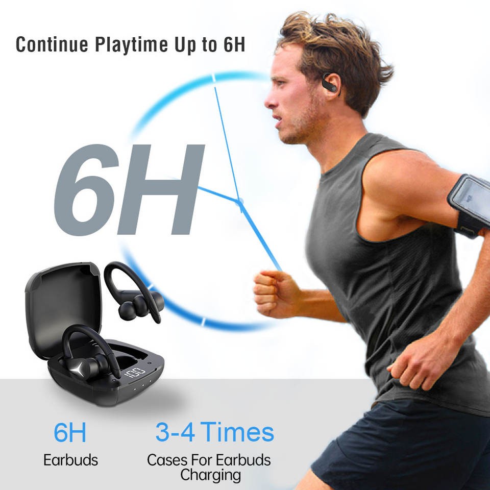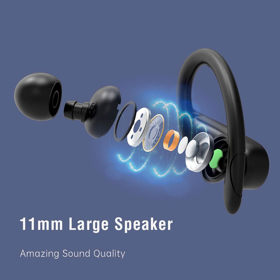- With the advanced bluetooth 5.0 technology compatible with Apple or Android cell phones ensures ultra-fast pairing. - Easy to control with tap or press touch panel of sports wireless headphones. - Left & Right earbuds sync transmission, both earbuds can be used in mono mode. - 700mAh, Extra 4 times full charge -reversible type-c charging cable - IPX5 sweat and weather resistant - 11mm bio-compound diaphragm driver and delicately tuned sound bring new experience with rich bass and immersive high mids. - No more falling out during sports with the ear hooks and ergonomic design